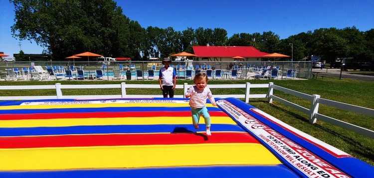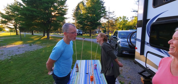 SUZI – It turns out the the Hanna-Barbera company has a slew of Yogi Bear themed Jellystone RV parks. Who knew? One of them happened to be in just the right spot for us near Frankenmuth, Michigan. It was a large RV park with nice swimming pools, a great playground for Leslynn, and loads of families with kids riding bikes around the paved roads and adults walking dogs and enjoying the pleasant evening with a campfire.