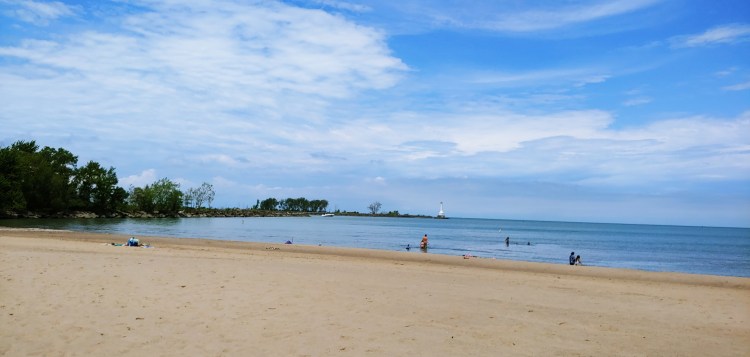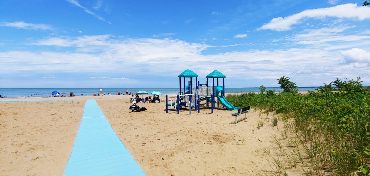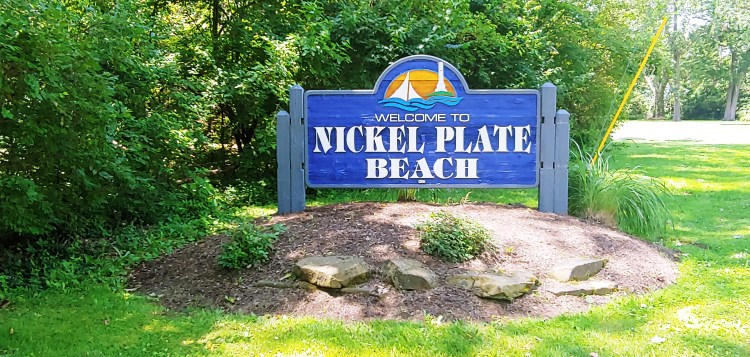 I met Kevin for lunch at the Sand Bar in Huron, Ohio. The woman collecting parking fees at the nearby beach told us that the Lake Erie perch was popular, so I had perch tacos for lunch. Delicious! Then Kevin got on his bike and I checked out the beach. I chatted with the woman for quite a while. She spent some years RV’ing alone and working in retail here and there. Her kids insisted that she settle near them during Covid, but she misses her RV life! Lots of swimmers were enjoying Nickel Plate Beach. The hot temperature made it tempting, but I skipped the swim this time and drove on to camp where Kevin was waiting.