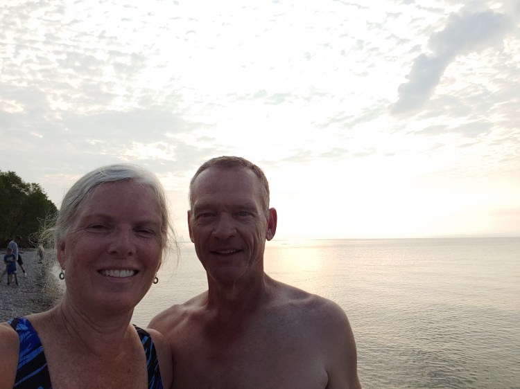 We camped at Geneva State Park, just across the road from the lake shore. The beach and park with bike trails turned out to be the best swimming beach yet for us. Kevin thought it ironic that I wanted to bike over there to check it out after he arrived in camp. We watched a bi-plane doing acrobatics over the water. It was humid with temperature in the 80’s. The beach/park was so nice that we rode back after dinner for a swim in the clear, crisp water. Then, after a rainy night, I biked over one more time in the morning to swim before my drive. Wish you (all) were here! It would have been fun to share with others.