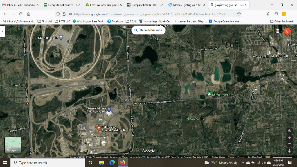 SUZI – We drove by the General Motors Proving Ground just before we arrived at Camp Dearborn to spend the night. Camp Dearborn is a huge camp built in 1948 and now owned and run by the city of Dearborn, MI. We enjoyed the great swimming pool and cycling with Leslynn on the paved roads of the park. In the morning, a thunderstorm knocked out power in the park. One lightning strike felt and sounded like it was very close. Inexplicably, Leslynn loved the thunder.