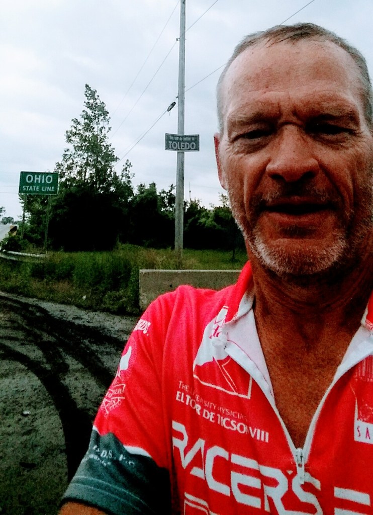 KEVIN – I had planned to start my ride by 7 am, however, an early morning thunderstorm intervened. I had a choice; wait for the rain to stop and deal with the increased afternoon headwind, or ride wet all day. I chose to wait. I started by 10:00 The roads were wet but I was dry. The wind did pick up as predicted. I rode the back roads. Toledo is on the state line. Google had me ride 10 miles through Toledo’s neighborhoods (some of them rough) and cross the Maumee River. I finished at 5:00 pm. My body felt fine. I could have kept riding, physically, but mentally I was done. Tired of watching for the next turn, tired of the wind and ready to see Suzi.