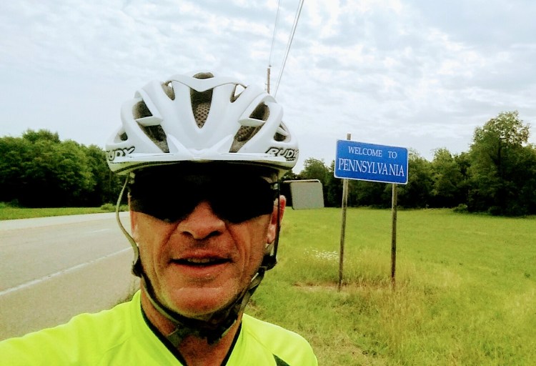 KEVIN – I finished Ohio and rode through part of Pennsylvania. Riding through rural Pennsylvania, I passed multiple wholesale nursery farms. Then I smelled strawberries as I rode by a U-pick. I got caught in a thunderstorm in Erie, Pennsylvania. I waited it out at a convenience store. When it had passed, I followed it through standing water and bubbling streams in ditches.