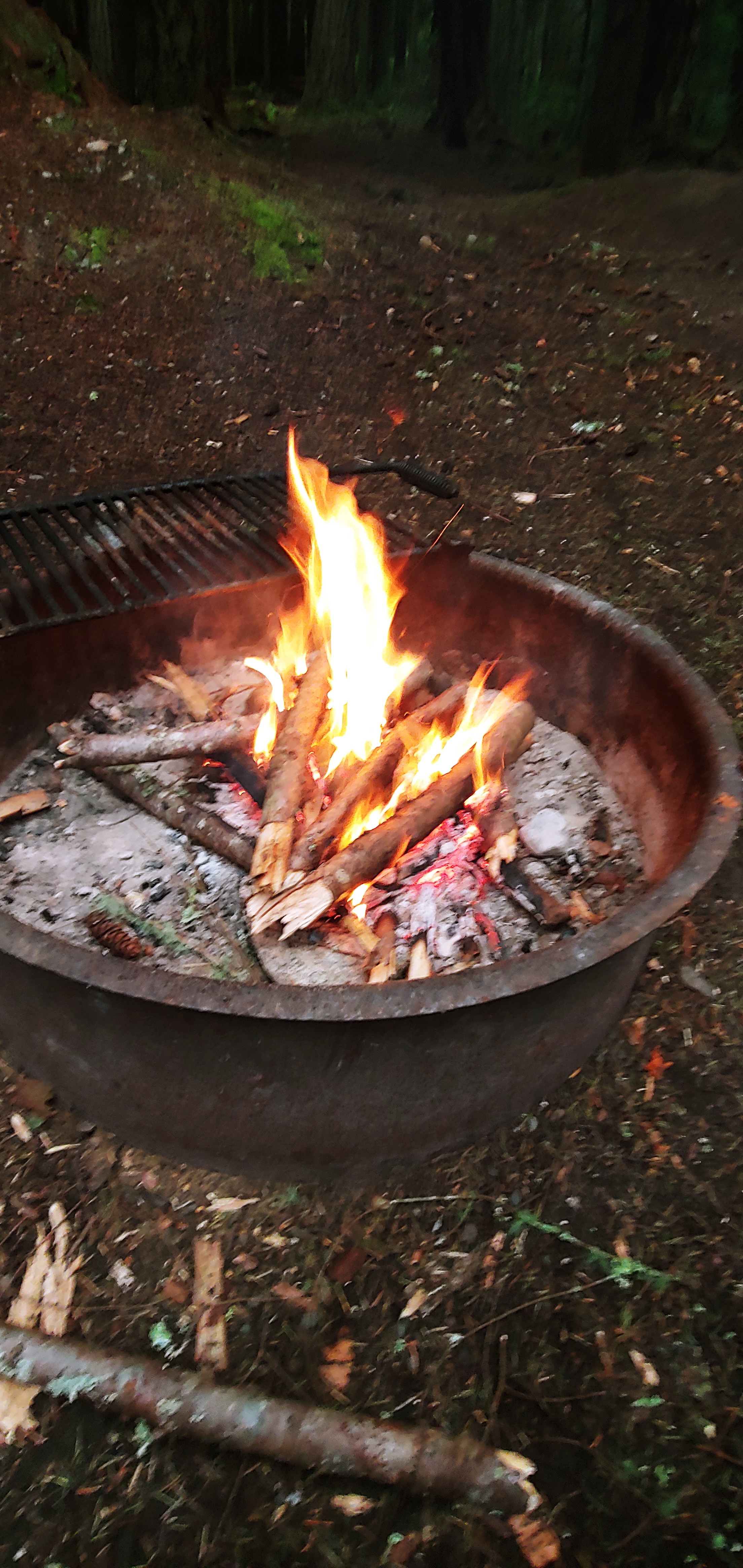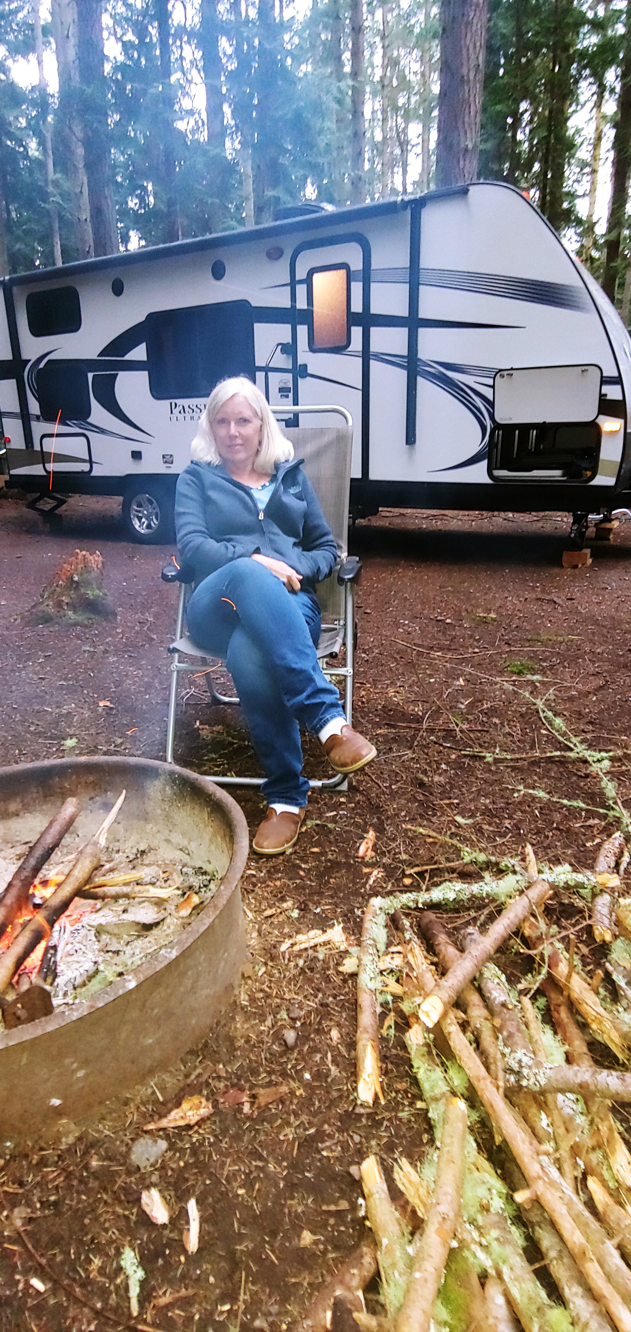 Washington Park campground is quiet this Thursday night beside the Salish Sea. Hauling our trailer over the Cascade Mountains gave Suzi some practice before she drives solo starting tomorrow. All is well but for a shocking lack of marshmallows.